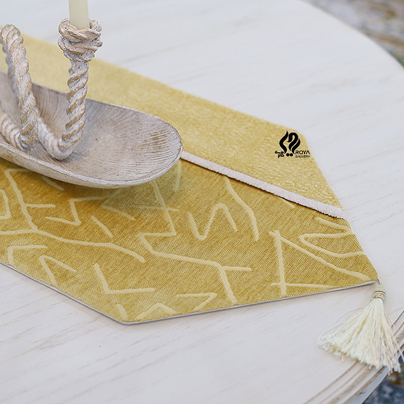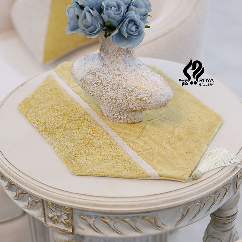 رانر ترکیبی ماندانا لیمویی دوخته شده با مخمل لیمویی طرحدار و تدی در ابعاد استاندارد جلومبلی، عسلی، رانر میزناهار خوری و … تولید می شود. این رانر می تواند گزینه مناسبی برای میز های سفید، کرم، نارنجی و … باشد.
