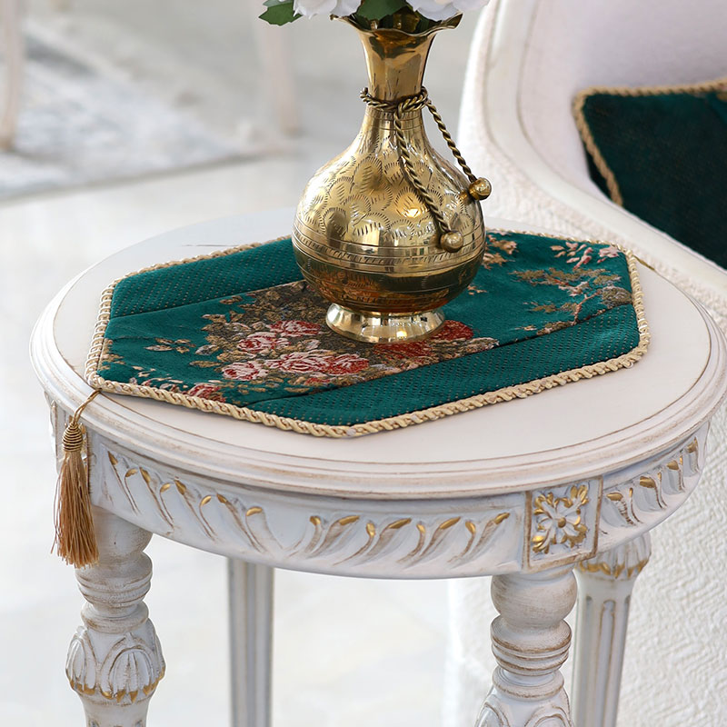 جنس و رنگ: مخمل درجه یک طرح گل و ساده رنگ سبز، مغزی دوزی قیطان ابریشمی طلایی، منگوله نسکافه ای