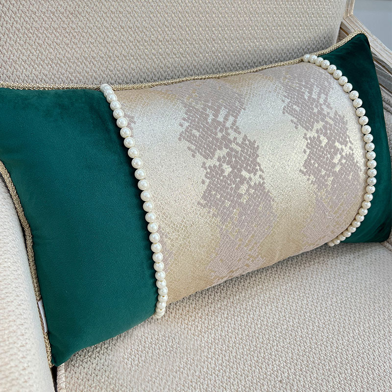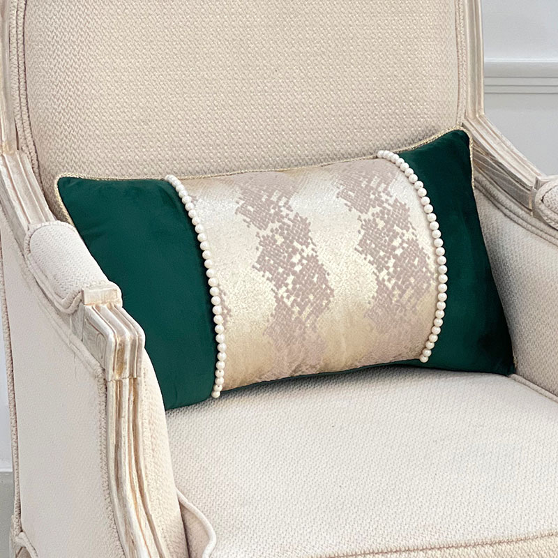 کوسن مستطیل مروارید طرح رز مخمل سبز کرم نسکافه